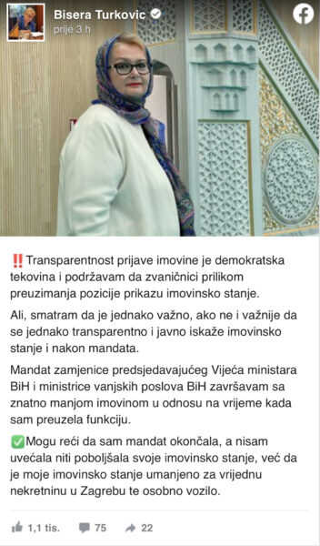 “Mandat zamjenice predsjedavajućeg Vijeća ministara BiH i ministrice vanjskih poslova BiH završavam sa znatno manjom imovinom u odnosu na vrijeme kada sam preuzela funkciju”, kazala je Turković.