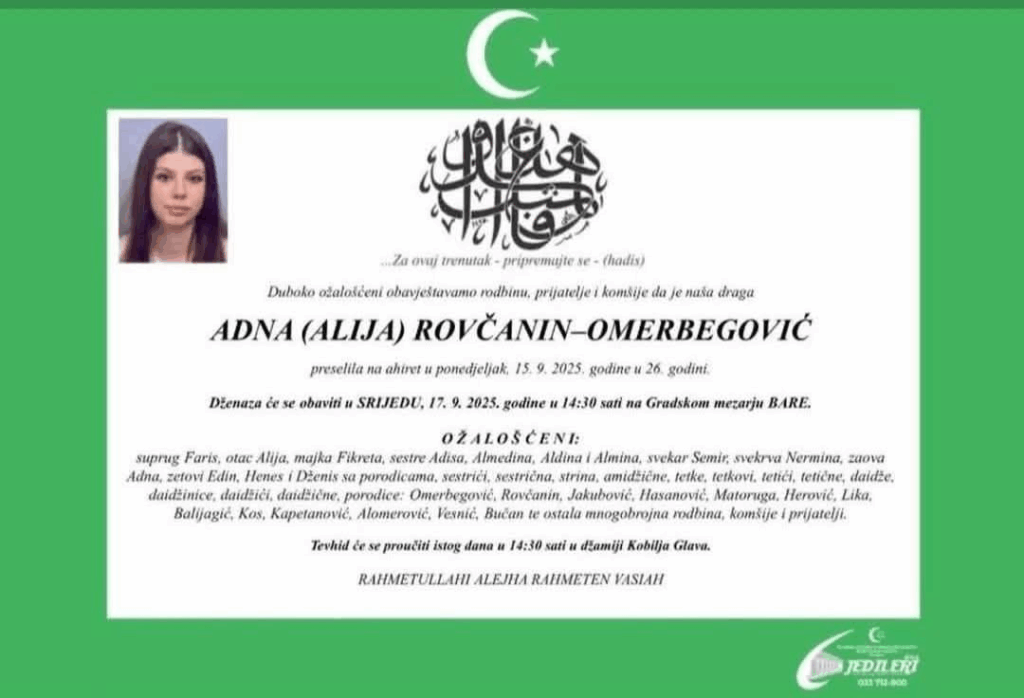 Duboko ožalošćena porodica obavještava rodbinu, prijatelje i komšije da je 15. septembra 2025. godine na Ahiret preselila Adna (Alija) Rovčanin–Omerbegović u svojoj 26. godini života.