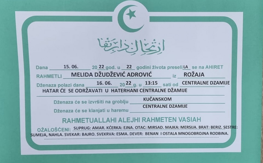 Ona je preselila na Ahiret u 22. godini života. Iza nje su ostali suprug Amar i kćerka Ejna.
