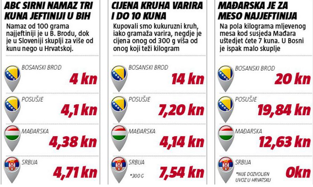 Iz Srbije se ne može uvesti meso i mlijeko jer smo mi članica EU-a. Mađarska je unatrag deset godina isplativa Hrvatima koji žive u rubnim mjestima uz granicu. Sirevi, sirni namazi, tjestenina, deterdženti, pelene, sredstva osobne higijene…, jeftiniji su nego u Hrvatskoj. I na jugu zemlje, naši stanovnici redovito idu preko granice u Posušje i Grude, gdje su svakodnevne gužve ispred šoping centara.