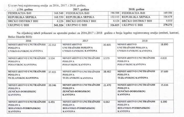 Zvanični podaci ministarstava unutrašnjih poslova govore kako su u Bosni i Hercegovini prošle godine legalno registrovana 278.272 komada oružja. Otprilike svaki 12. stanovnik BiH legalno je naoružan ukoliko se uzmu u obzir već zastarjeli podaci iz posljednjeg popisa stanovništva. Pred državnim parlamentarcima uskoro bi se trebao naći Izvještaj o radu Koordinacionog odbora za kontrolu malog i lakog naoružanja u Bosni i Hercegovini za 2018. godinu.