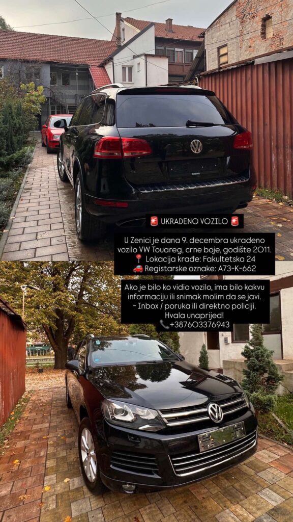 Na području Zenice zabilježena je krađa putničkog vozila marke Volkswagen Touareg, crne boje, godište 2011, potvrđeno je iz objave vlasnika koja se dijeli na društvenim mrežama, piše 072info