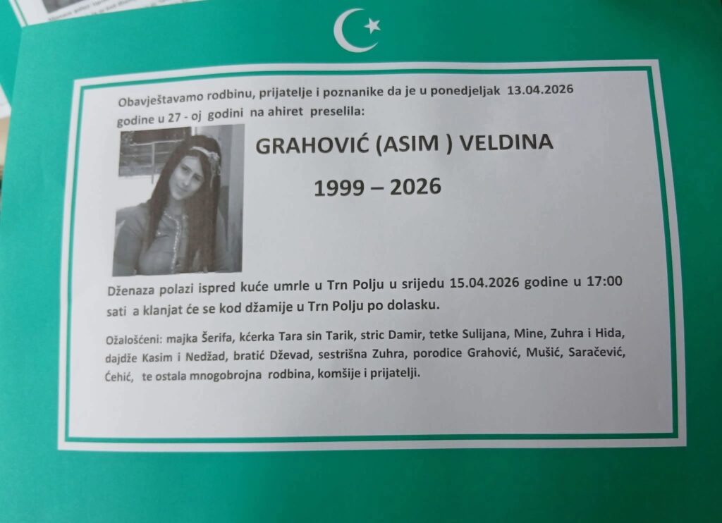 Prema informacijama iz osmrtnice, Veldina je preselila u ponedjeljak, 13. aprila 2026. godine. Iza nje su ostali neutješni članovi porodice – majka Šerifa, kćerka Tara, sin Tarik, kao i brojna rodbina i prijatelji.