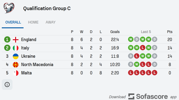 Ukrajinci su imali šansu da se plasiraju direktno na Euro, ali su za takvo nešto morali pobijediti Italiju. Iz grupe C će na Evropsko prvenstvo Engleska, koja je bila prva, te Italija.