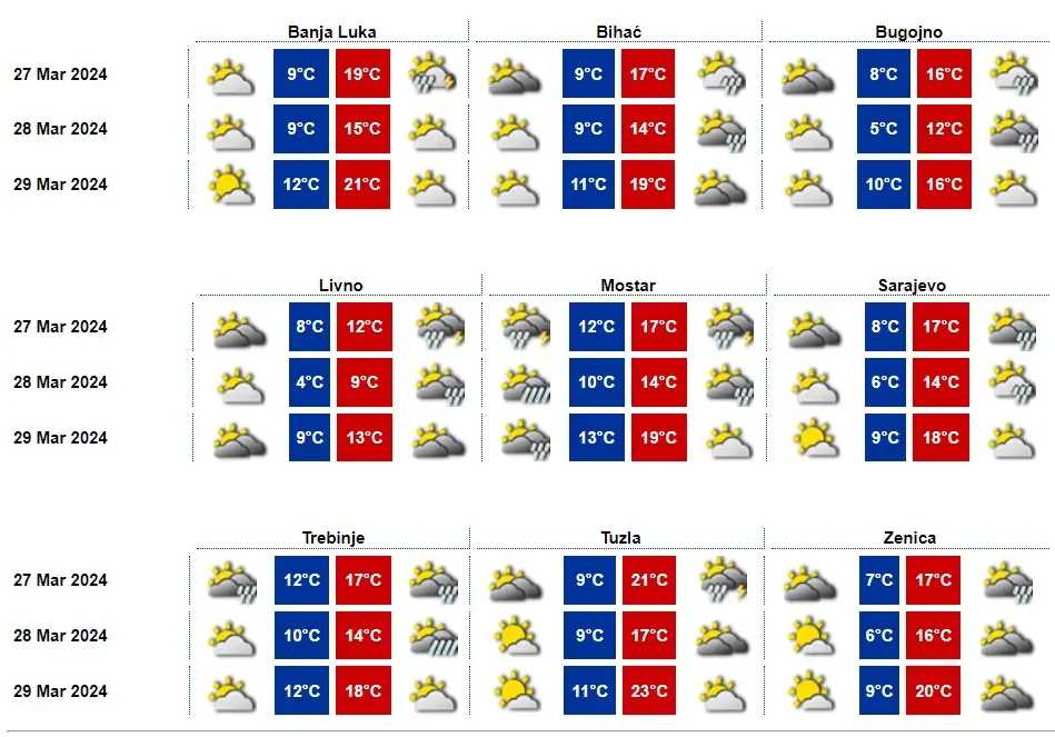 Sutra u Bosni i Hercegovini umjereno do pretežno oblačno vrijeme. Povremeni lokalni pljuskovi se očekuju u Hercegovini i na jugozapadu Bosne. Tokom noći na četvrtak kiša se očekuje širom zemlje.