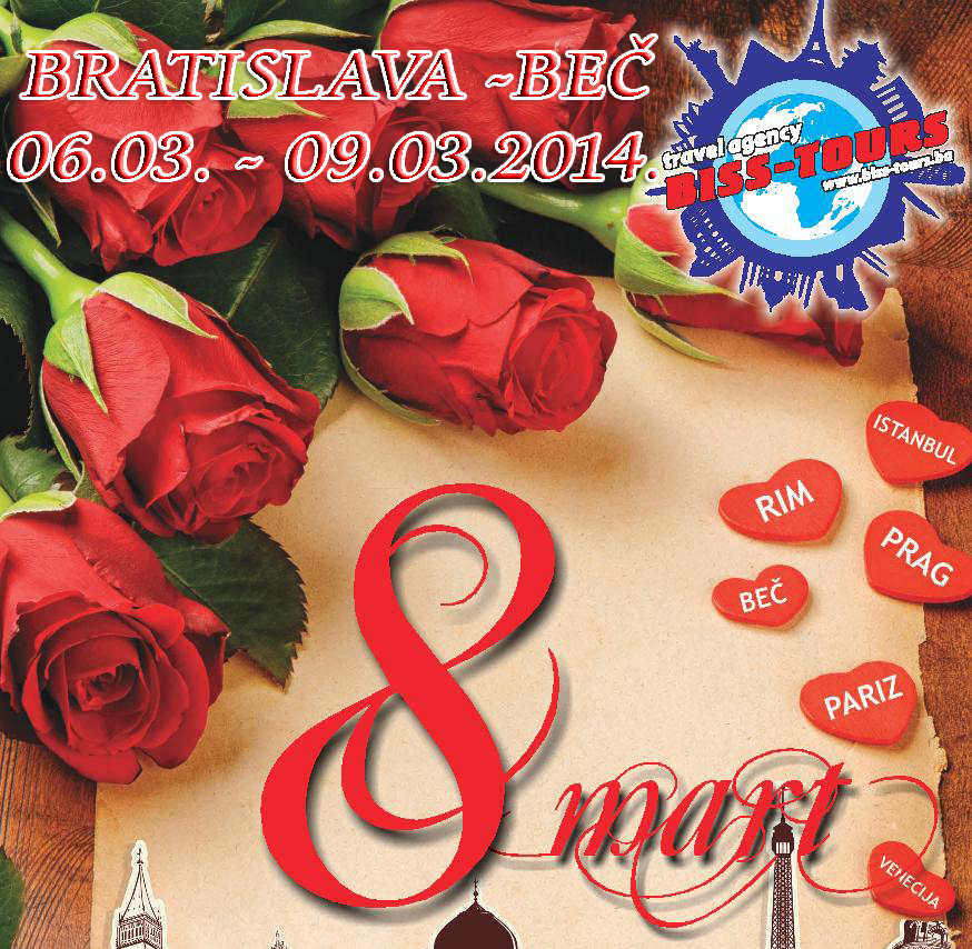 Dočekajte 8. mart – Dan žena u Beču, najvećem gradu Slovačke, a gdje vas po veoma pristupačnoj cijeni vodi eminentna turistička agencija “BISS-TOURS” i to za samo 238 KM. U cijenu aranžaman uključen je prijevoz autobusom visoke turističke klase, smještaj u hotelu sa 3*** na bazi dva noćenja sa doručkom. U okviru programa razgledajte i posjetite sve znamenitosti ovog prekrasnog grada uz pratioca grupe koji će vas upoznati sa svim informacijama koje do sada niste znali. Pored toga, agencija “BISS-TOURS” svojim klijentima obećava pripremu, organizaciju i garanciju putovanja. Više informacija potražite na oficijelnoj stranici BISS-TOURS-a www.biss-tours.ba ili ih kontaktirajte na broj telefona: 032/245-451 (Zenica) i 033/236-620 (Sarajevo).
