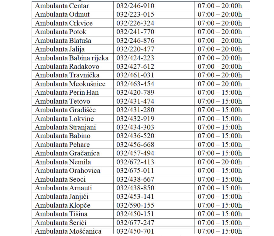 Vikendom i praznicima dežurna je ambulanta Centar koju možete pozvati na broj telefona 032/246-910 a koja radi od 07:00h do 20:00h, te ambulanta Nemila koja radi u istom periodu, a dostupna je na broj 032/672-413.