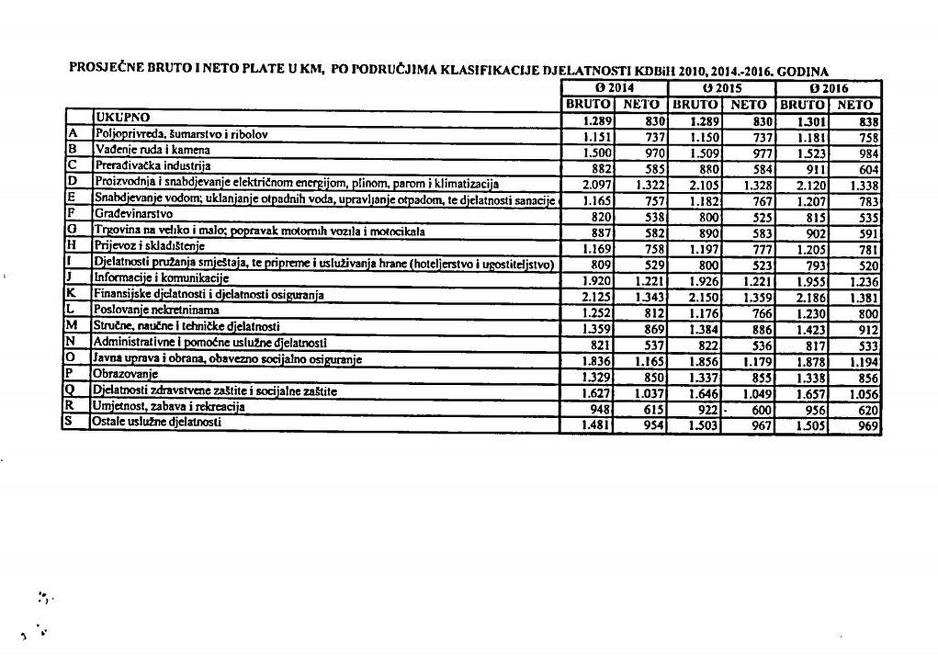 U skladu s tim Agencija za statistiku BiH dostavila je prosječne bruto i neto plate za period 2014., 2015. i 2016. godinu po područjima Klasifikacije djelatnosti KDBiH 2010., 2014. i 2016. godina.