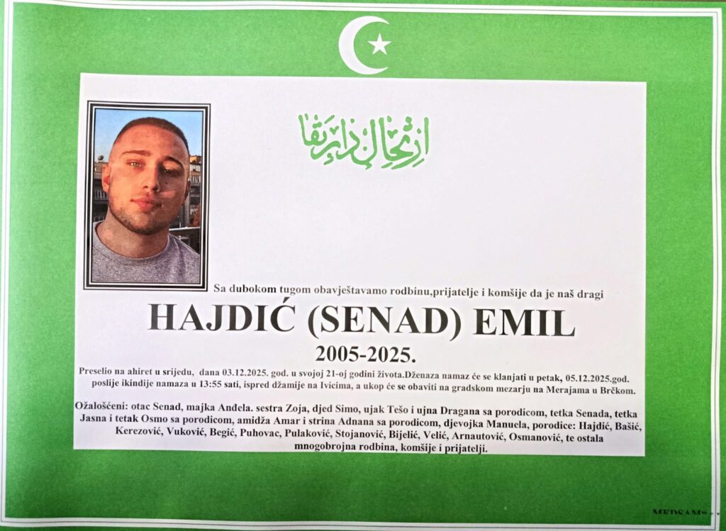 Sa tugom se iz Brčkog širi vijest o smrti Emila Hajdića, sina Senada Hajdića, koji je na ahiret preselio u srijedu, 3. decembra 2025. godine, u svojoj 21. godini života.