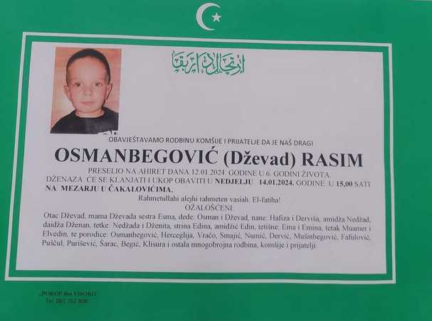 Na Bolji svijet preselio je Rasim, 6 godišnji dječak iz Visokog. Dženaza namaz će se klanjati danas u mezarju u Čakalovićima.