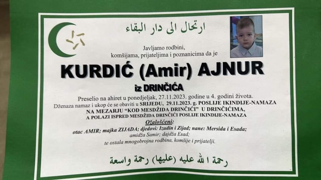 Tešanjski kraj obavijena je tugom nakon vijesti da ih je zauvijek napustio maleni Ajnur Kurdić, piše 072info.