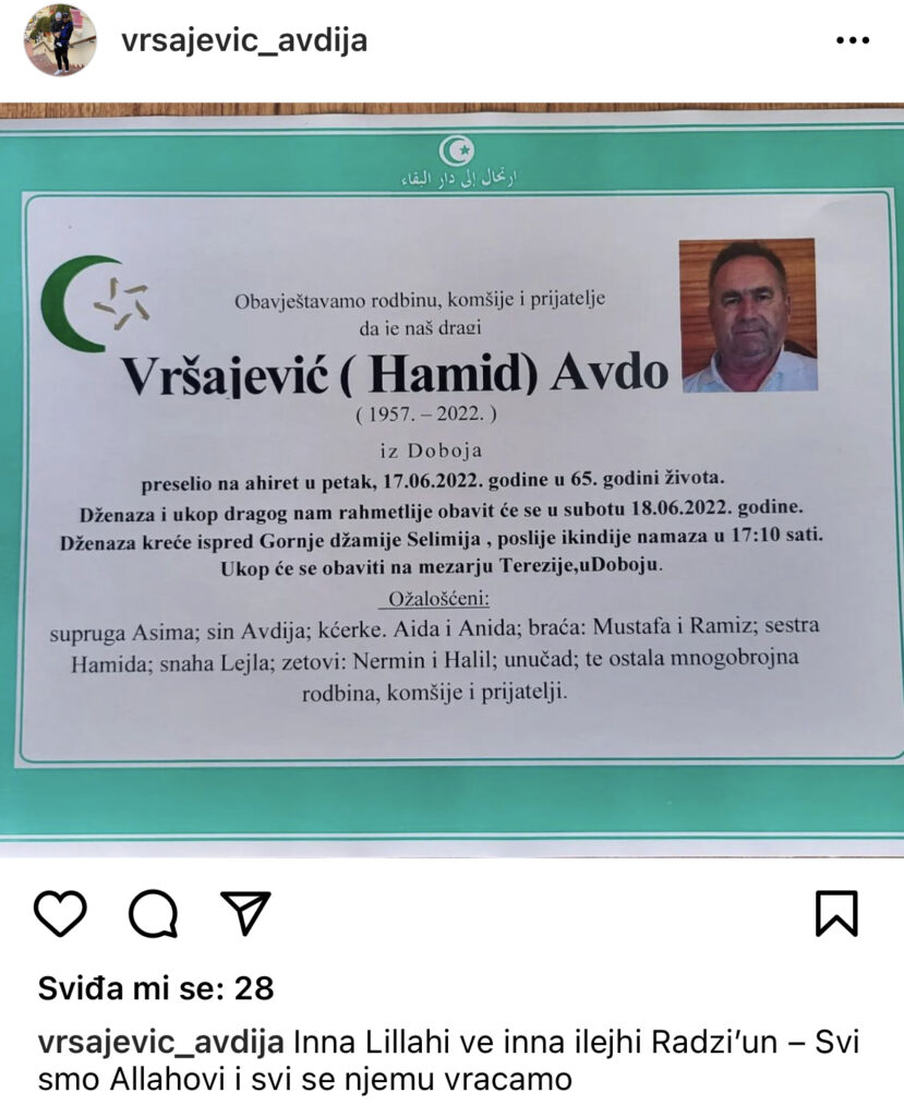 Njegov otac preselio je u 65. godini života, a ovu informaciju Vršajević je obznanio na svom Instagram profilu.