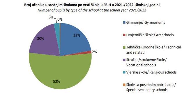 Prošle školske godine od 70.004 upisanih učenika, 15.617 (22 posto) je išlo u gimnazije, 37.112 (53 posto) u tehničke škole, 14.053 (20 posto) u stručne, 939 (2 posto) u umjetničke, 2.108 (3 posto) u vjerske škole i 195 (manje od jedan posto) u škole za učenike sa posebnim potrebama.