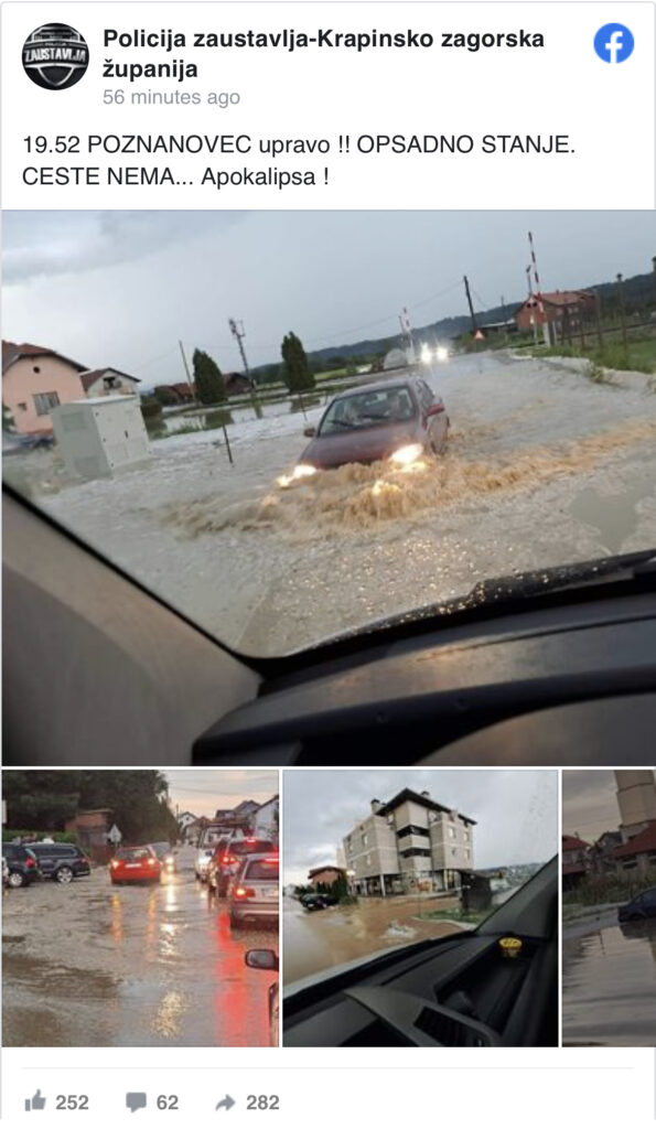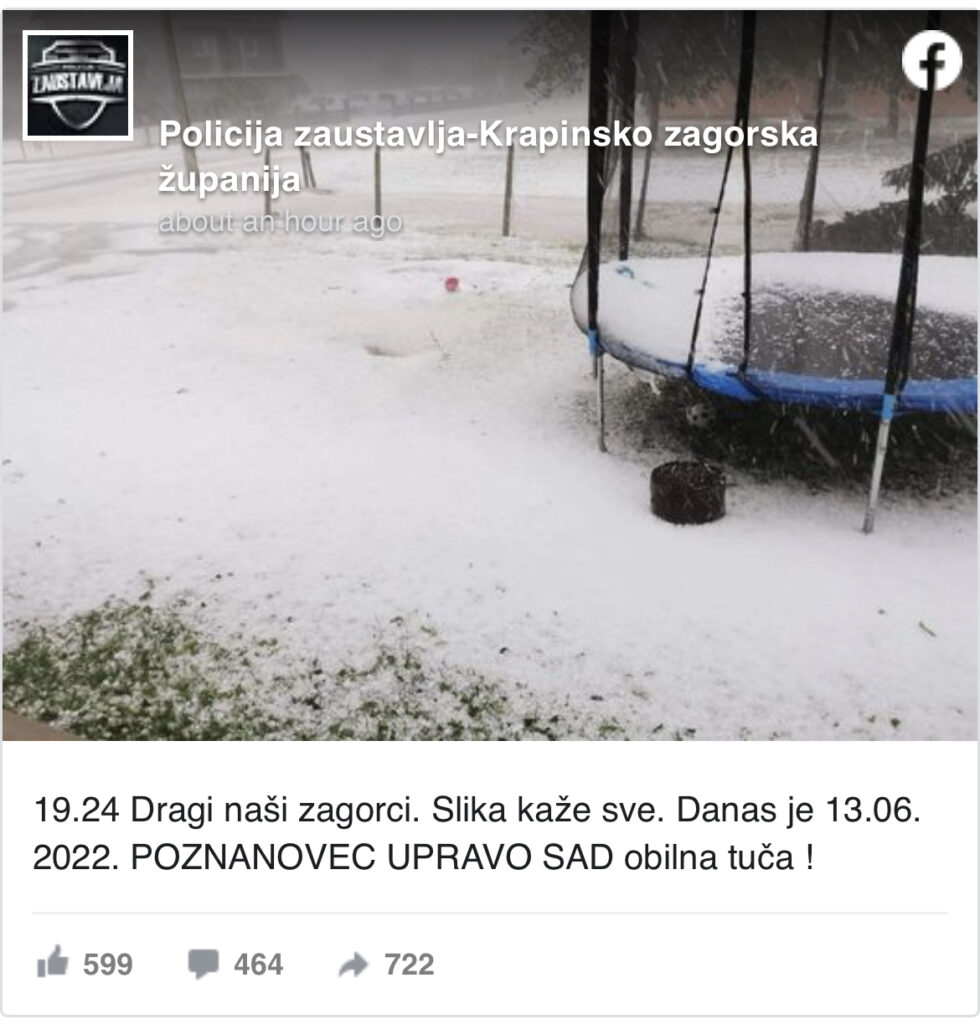 Veliko nevrijeme praćeno snažnim gradom pogodilo je Hrvatsku. Padavine su u mjestu Poznanovec uzrokovale poplave, a građani putem društvenih mreža dijele fotografije.