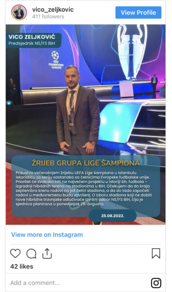 Vico Zeljković, predsjednik Fudbalskog saveza Bosne i Hercegovine večeras je prisustvovao žrijebu Lige prvaka u Istanbulu. Tom prilikom je Zeljković najavio kako će nastaviti razgovore o nastavku renoviranja terena u BiH.