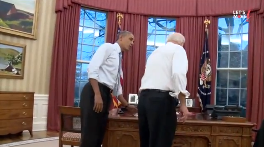 Video prikazuje Obamu i Bidena kako u odijelima džogiraju hodnicima Bijele kuće kako bi odgovorili na izazov koji je postavila Michelle Obama, koja želi da podigne svijest o tome da je potrebno da djeca budu fizički aktivnija.