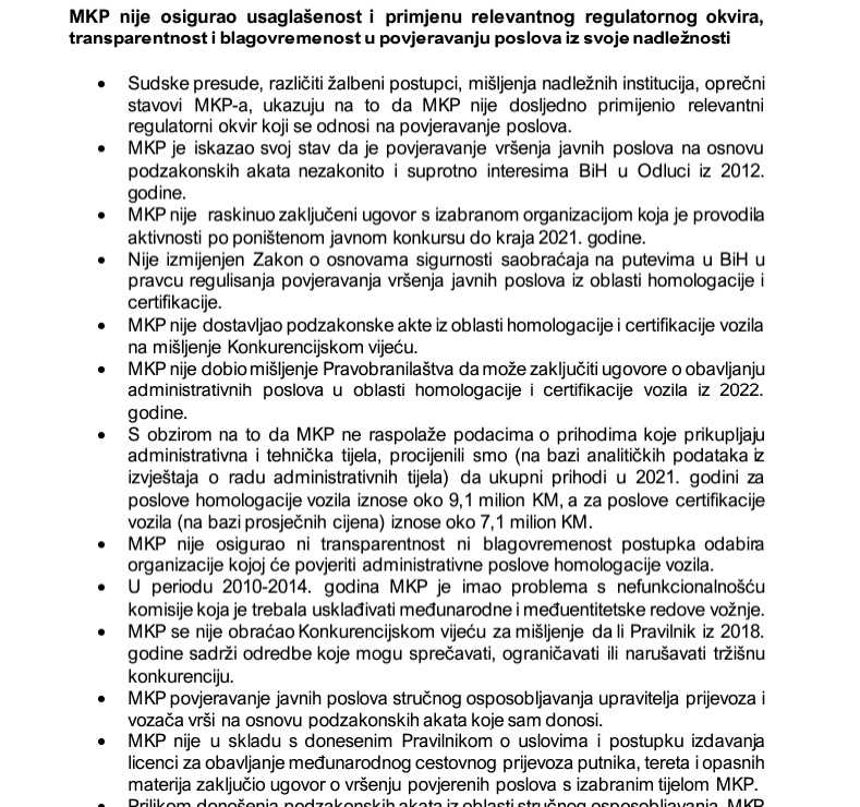 -Sudske presude, različiti žalbeni postupci, oprečni stavovi MKP-a, mišljenja Pravobranilaštva i Konkurencijskog vijeća ukazuju na to da MKP nije dosljedno primijenio relevantni regulatorni okvir koji se odnosi na povjeravanje poslova homologacije i certifikacije vozila – konstatovali su revizori.