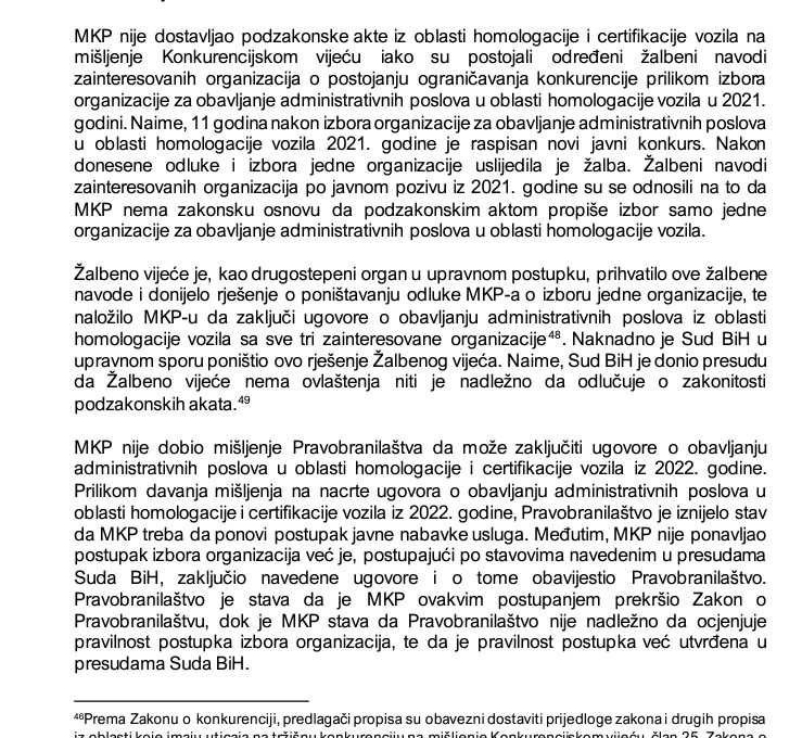 Prilikom davanja mišljenja na nacrte ugovora o obavljanju administrativnih poslova u oblasti homologacije i certifikacije vozila iz 2022. godine, Pravobranilaštvo je iznijelo stav da MKP treba da ponovi postupak javne nabavke usluga. Međutim, navode revizori, MKP nije ponavljao postupak izbora organizacija već je, postupajući po stavovima navedenim u presudama Suda BiH, zaključio navedene ugovore i o tome obavijestio Pravobranilaštvo.