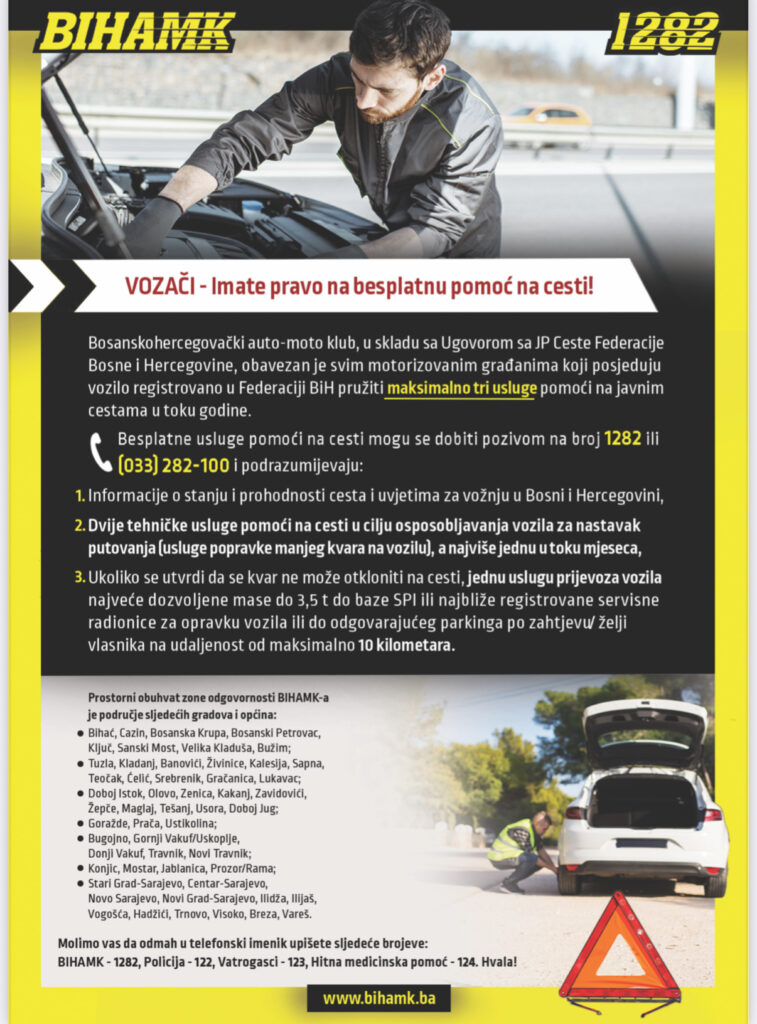 Besplatne usluge pomoći na cesti mogu se dobiti pozivom na broj 1282 ili (033) 282-100, i podrazumijevaju: