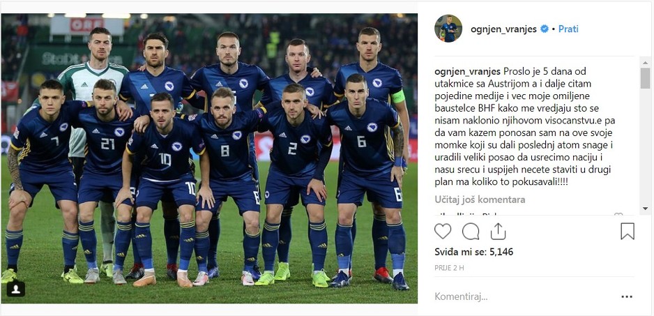 “Prošlo je pet dana od utakmice sa Austrijom a i dalje čitam pojedine medije i već moje omiljene bauštelce BHF kako me vrijeđaju što se nisam naklonio njihovom visočanstvu. E, pa da vam kažem, ponosan sam na ove svoje momke koji su dali posljednji atom snage i uradili veliki posao da usrećimo naciju i našu sreću i uspjeh nećete staviti u drugi plan ma koliko to pokušavali!”, poručio je Vranješ putem Instagrama.