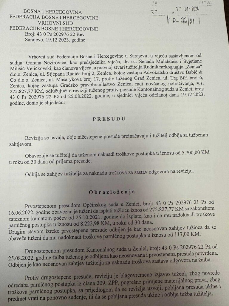 Vrhovni sud Federacije Bosne i Hercegovine odlučujući o Reviziji Grada Zenica preinačio je prvostepenu presudu Općinskog suda u Zenici i drugostepenu presudu Kantonalnog suda u Zenici i odbio tužbeni zahtjev Rudnika mrkog uglja “Zenica” d.o.o. Zenica radi novčanog potraživanja u visni od 275.827,77 KM prema Gradu Zenica.