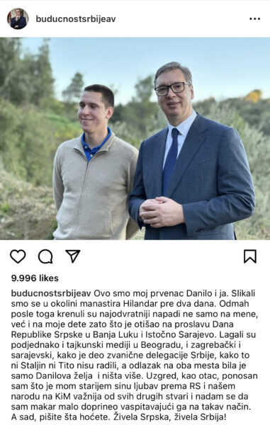 Uzgred, kao otac, ponosan sam što je mom starijem sinu ljubav prema RS i našem narodu na Kosovu važnija od svih drugih stvari. I nadam se da sam makar malo doprinio vaspitavajući ga na takav način. A sad, pišite šta hoćete. Živjela Srpska, živjela Srbija!”, napisao je Vučić.