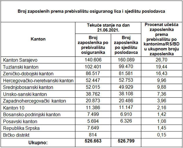 Broj zaposlenih u Federaciji BiH prema prebivalištu zaposlenika na dan 21. 6. 2021. godine iznosio je 526.663.