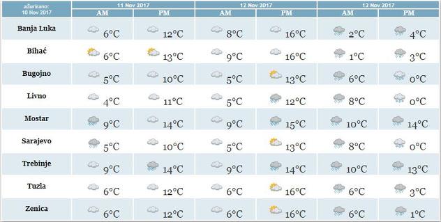 jugozapadu Bosne. Jače naoblačenje sa sjevera koje će usloviti obilnije padavine i zahlađenje se prognozira u noći na ponedjeljak. prema najavama meteorologa od poslijepodnevnih sati su mogući i jaki udari juga. Najniža jutarnja temperatura zraka uglavnom između 4 i 9 stepeni celzija, a najviša dnevna između 12 i 17 stepeni celzija.