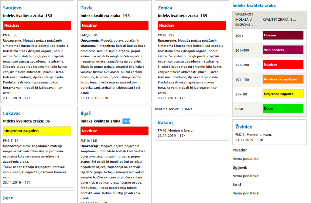 Prema mjerenjima kvaliteta zraka u BiH – večeras je u mnogim gradovima zrak nezdrav. Tako je u Zenici indeks kvalitete zraka 169, Sarajevu 153, Tuzla 155 a Ilijašu 189.