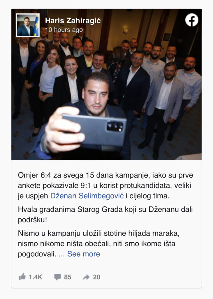 – Omjer 6:4 za svega 15 dana kampanje, iako su prve ankete pokazivale 9:1 u korist protukandidata, veliki je uspjeh Dženana Selimbegovića i cijelog tima.