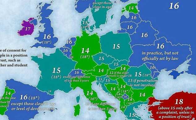 Za legalno stupanje u seksualne odnose u Finskoj, Belgiji ili Rusiji, recimo, potrebno je napuniti 16 godina. Za pristanak na seksualni odnos u Vatikanu, Turskoj ili Malti, ipak, potrebno je biti punoljetan.