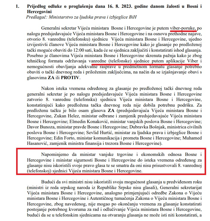 -Budući da svi ministri nisu iskoristili svoju mogućnost glasanja u predviđenom roku (ministri iz reda srpskog naroda iz RS-a nisu glasali), Generalni sekretarijat nije mogao po okončanju vremena za glasanje konstatirati postojanje potrebnog kvoruma za rad i odlučivanje Vijeća ministara – stoji, između ostalog, u ovom zapisniku.