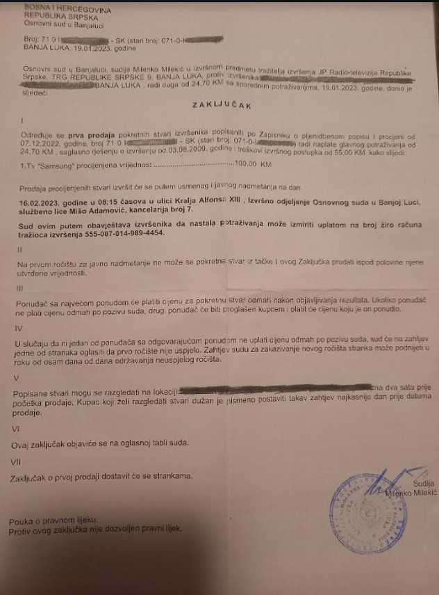U nastavku stoji da je vrijednost televizora procijenjena na 100 KM i da će biti prodat putem javnog nadmetanja 16. februara.