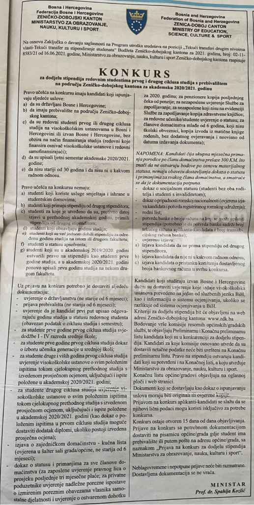 Ministarstvo za obrazovanje nauku kulturu i sport Zeničko-dobojskog kantona raspisuje KONKURS za dodjelu stipendija redovnim studentima prvog i drugog ciklusa studija s prebivalištem na području Zeničko-dobojskog kantona za akademsku 2020./2021. godinu.