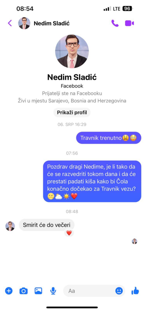 Upitan da li će se vrijeme u Travniku razvedriti tokom dana i da li će kiša prestati padati kako bi Čola konačno dočekao “za Travnik vezu”.