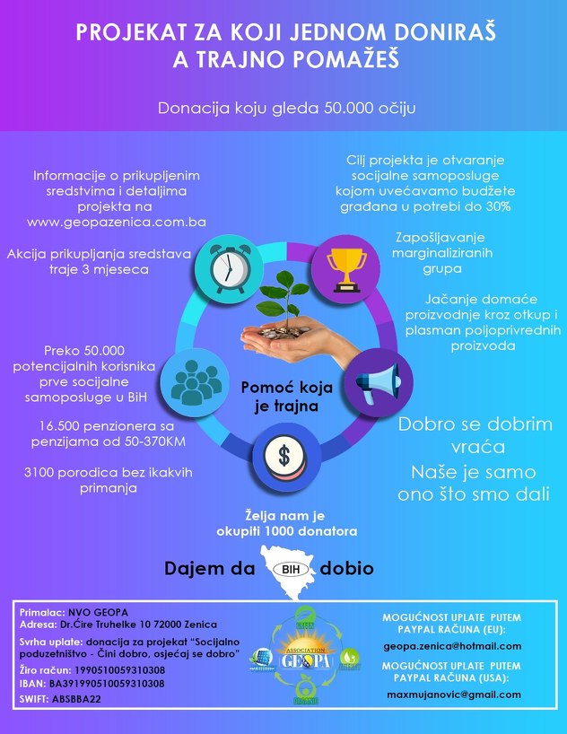 U Zenici bi uskoro trebala biti otvorena prva socijalna samoposluga u Bosni i Hercegovini. Socijalno poduzetništvo u EU je nadolazeći trend koji predstavlja priliku za razvoj poduzetništva, zapošljavanja, ali i poboljšanja života marginaliziranih grupa svakog društva.Udruženje GEOPA iz Zenice kroz svoj rad već godinu dana promoviše i socijalno poduzetništvo kroz organizovanje okruglih stolova u saradnji s partnerima iz OCD-a, a posljednji projekt koji planiraju realizirati baziran je na socijalnoj samoposluzi koja bi trebala biti prva ovog tipa u Bosni i Hercegovini i koja će raditi kao i svaki trgovački objekat.