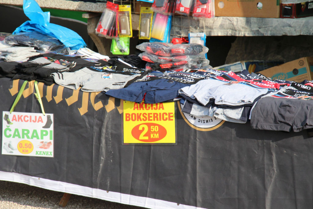 – Akcija, bokserice po 2,50 KM, a dva komada mogu i za 5 KM. Na štandu po vrlo povoljnim cijenama možete pronaći i šrafcigere, šminku, igračke. Priđite, narode, samo marka, a čarape i 0,50 KM – povikuju trgovci.