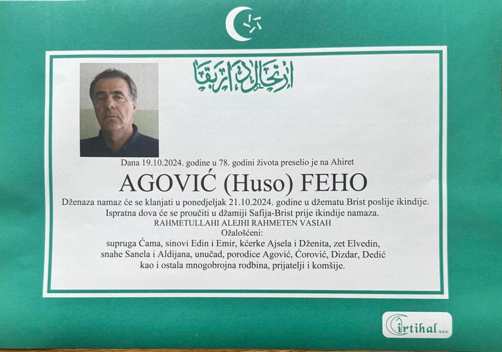 Zenica je obavijena tugom nakon vijesti o smrti Fehe Agovića, omiljenog nastavnika historije, koji je preminuo u 78. godini života. Generacije učenika iz Osnovne škole “Edhem Mulabdić” u Zenici i ‘Mirko Vejinović’ na Kaoniku sjećat će se njegovih lekcija i mudrosti, koje su ostavile dubok trag na njihove živote.