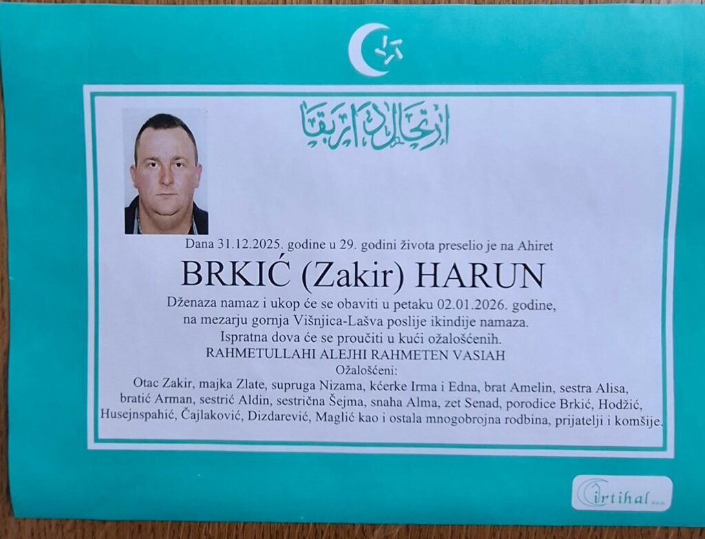 Tragedija je zavila u crno Višnjicu-Lašvu kod Zenice. U utorak, 31. decembra 2025. godine, prerano je preminuo Harun Brkić, 29-godišnjak, ostavljajući porodicu, prijatelje i cijelu zajednicu u velikom šoku, piše 072info.