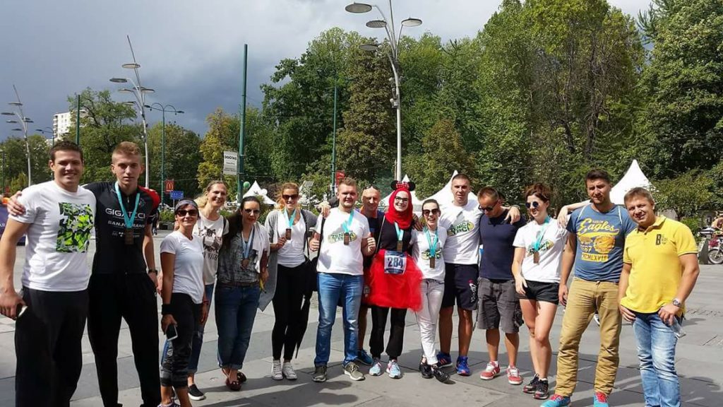 Onda je došao i taj dan, Sarajevski polumaraton, jedan od najpopularnijih i najmasovnijih događaja u regionu. Dogovor je bio da se sastanemo u 9:00, sat vremena prije utrke. Svi super uzbuđeni i pod nabojem adrenalina. Pljuštali smo od pozitivne energije. Skupa smo se zagrijali, fotkali, djelili gelove, vodu i kovali planove kako preživjeti utrku. Podjelili smo se u ekipice. Iskusniji su pomagali onima koji prvi put savladavaju tu distancu, neki su išli skupa loviti određeno vrijeme, a većina je trčali laganini upijajući atmosferu oko sebe. Iako je bilo jako toplo svi smo uspjeli u zadanim ciljevima i okitili smo se medaljama. Pale su suze radosnice, zagrljaji, čestitke, veselje, lični rekordi i novi dogovori.