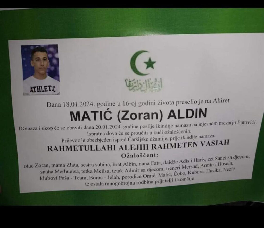 Zenica je u šoku i nevjerici nakon tužne vijesti da je preminuo Aldin Matić-Ico, a kojeg je 27. decembra njegov drug, također 16-godišnjak, rano u kući ispalivši hitac iz puške šmajser, piše 072info.