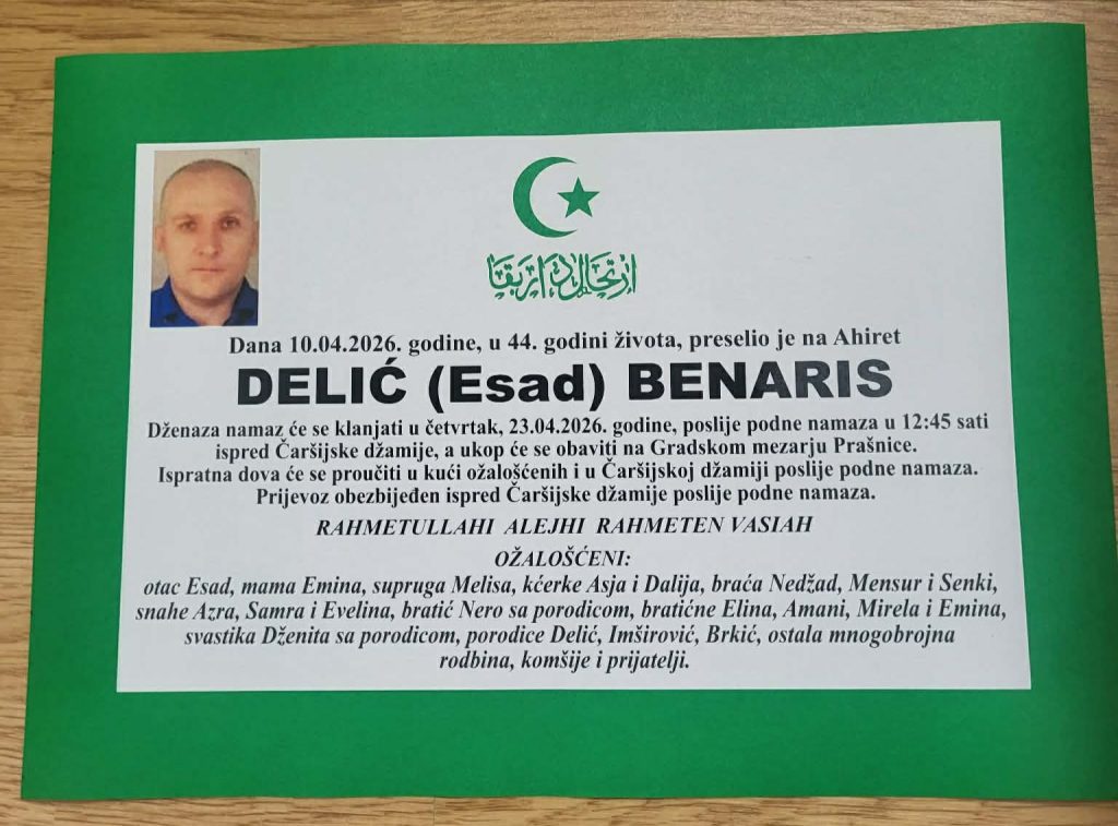 S velikom tugom obavještavamo javnost da je 10. aprila 2026. godine, u 44. godini života, preminuo Benaris (Esad) Delić, čovjek kojeg je poznavala gotovo cijela Zenica, piše 072info.