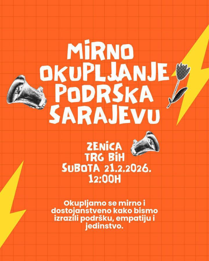 U Zenici će u subotu, 21. februara 2026. godine, s početkom u 12:00 sati, biti održano mirno okupljanje podrške Sarajevu, piše 072info.