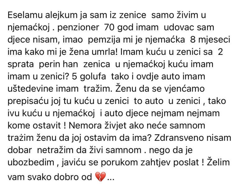 ZENIČANIN TRAŽI SRODNU DUŠU: Ostavit ću joj kuću u Zenici i Njemačkoj, ne mora živjeti sa mnom, nego da je obezbijedim…