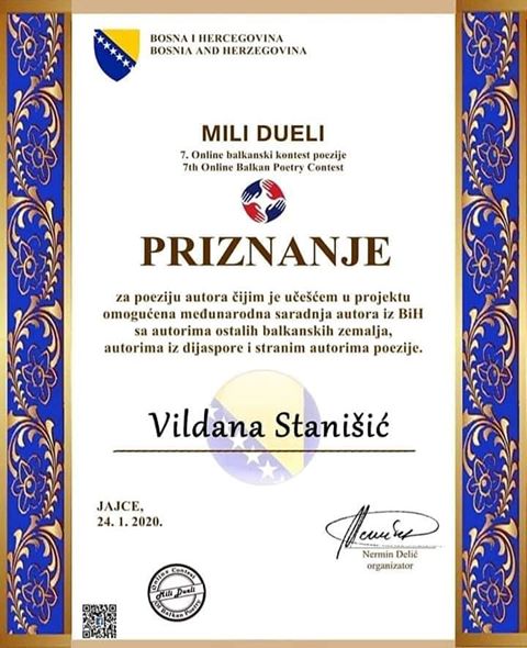 Na 7.Online balkanskom kontestu poezije “MILI DUELI ” u kategoriji 545 autora iz svih balkanskih zemalja i 29 zemalja svijeta, Žepčanka Vildana Stanišić izborila je plasman u krug najboljih autora Balkana.