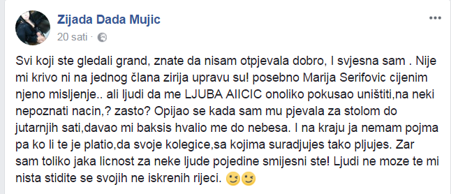 “Svi koji ste gledali Grand, znate da nisam otpjevala dobro, i svjesna sam toga. Nije mi krivo ni na jednog člana zirija upravu su, posebno Marija Šerifović i cijenim njeno mišljenje. Ali ljudi da me LJUBA AIIČIĆ onoliko pokušao uništiti, na neki nepoznat način. Opijao se kada sam mu pjevala za stolom do jutarnjih sati, davao mi bakšiš hvalio me do nebesa. I na kraju ja nemam pojma pa ko li te je platio, a svoje kolegice, sa kojima surađuješ tako pljuješ. Zar sam toliko jaka ličnost za neke ljude pojedine, smiješni ste! Ljudi ne može te mi ništa, stidite se svojih neiskrenih riječi” , napisala je Zijada.