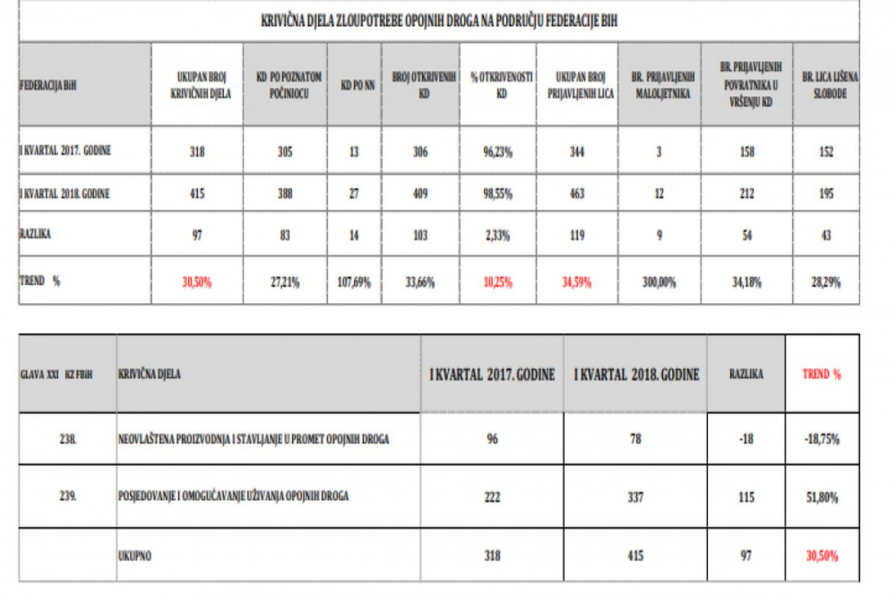 Pokazuju ovo podaci Federalne uprave policije prema kojima je od januara do marta ove godine evidentirano povećanje krivičnih djela zloupotrebe opojnih droga na području FBiH za 97 (ili 30,50%), te povećanje broja prijavljenih za 119 ili 34,59% u odnosu na isti period 2017. godine.