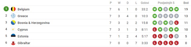 Bh. reprezentacija je s ovim porazom ostala na trećem mjestu grupe H s 11 osvojenih bodova. Grčka na drugoj poziciji ima bod više, dok je Belgija na čelu tabele s 19 osvojenih bodova.
