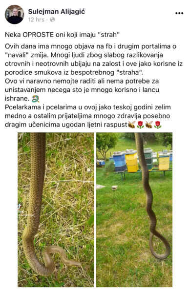 Profesor Sulejman Alijagić koji je zaljubljenik u prirodu i životinje, na svom facebook profilu objasnio je da zmije mogu biti korisne pogotovo ako dolaze iz porodice smukova.