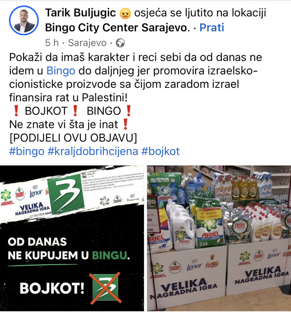 Danas imamo situaciju gdje isti ljudi žele bojkotovati i najveći trgovački lanac u Bosni i Hercegovini Bingo zbog kako kažu da promovišu Izraelsko-cionističke proizvode sa čijom zaradom finansiraju Izrael finansira rat u Palestini.
